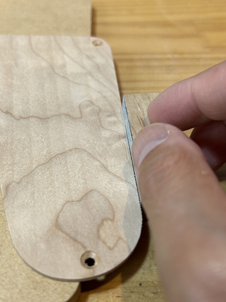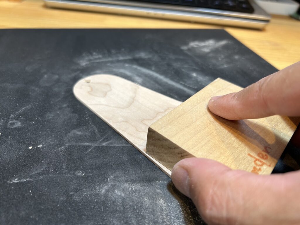 側面が面に対して垂直に研磨できるよう、サンディングブロック代わりの端材に、両面テープでサンドペーパーを貼り付けて使用します。