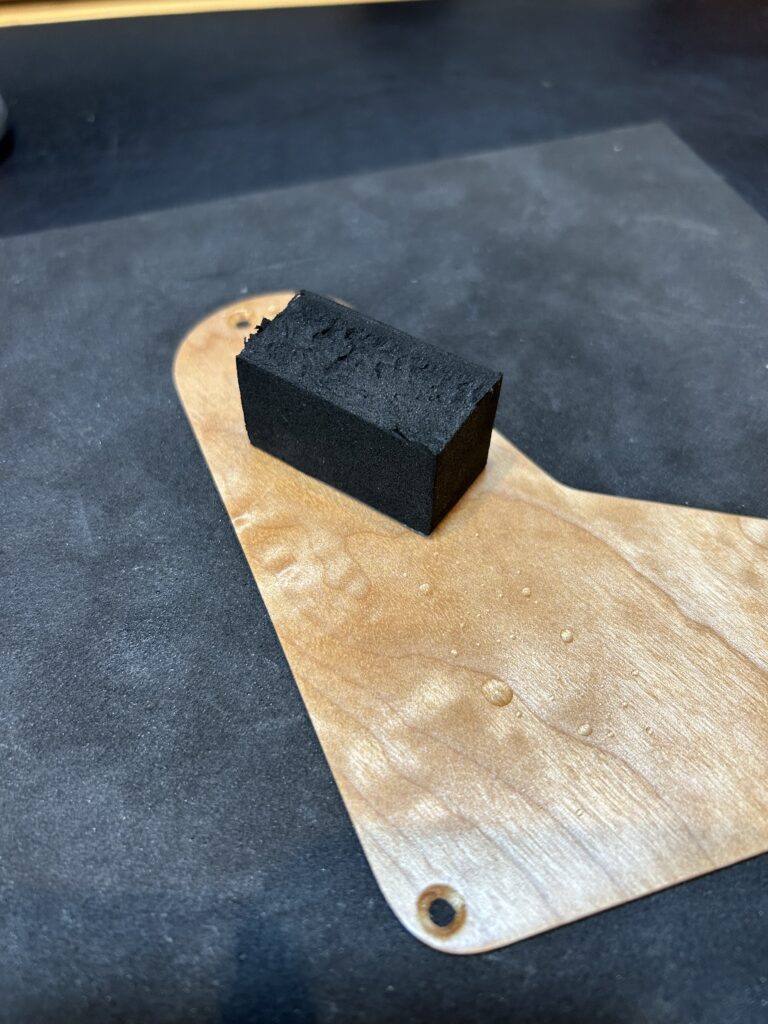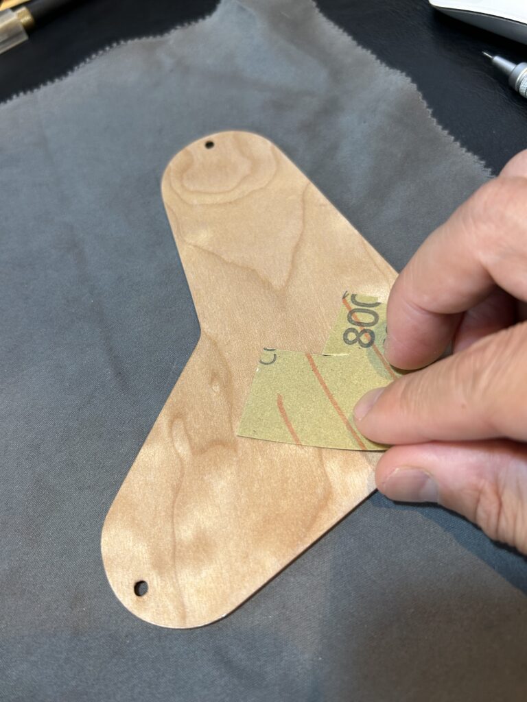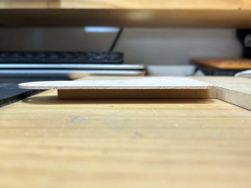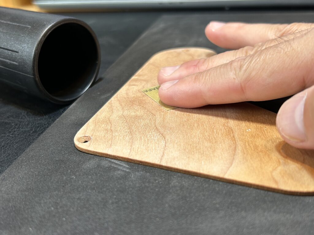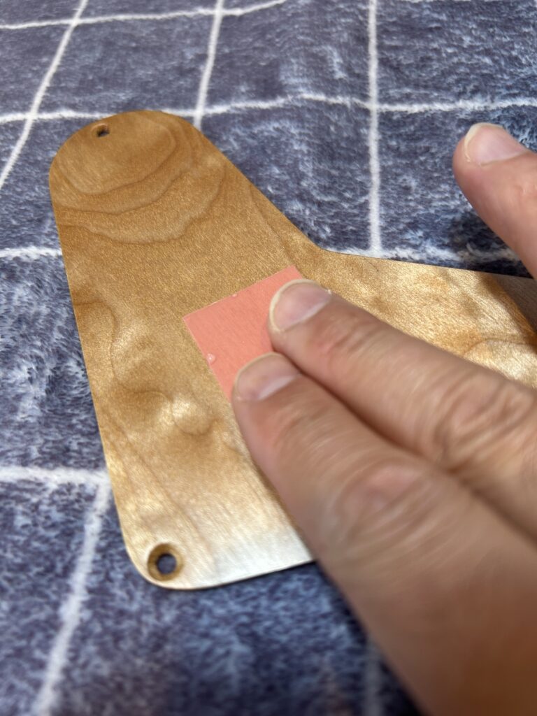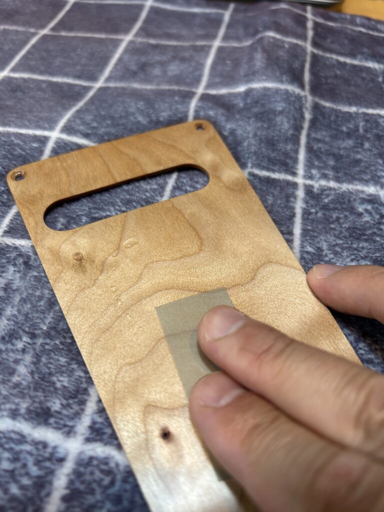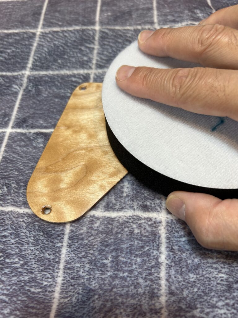 5mmぐらいの板にバックプレートを乗せて、端材サンディングブロックはテーブルの上を滑らせながら研磨します。