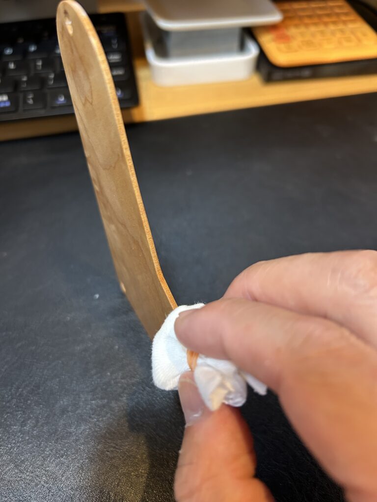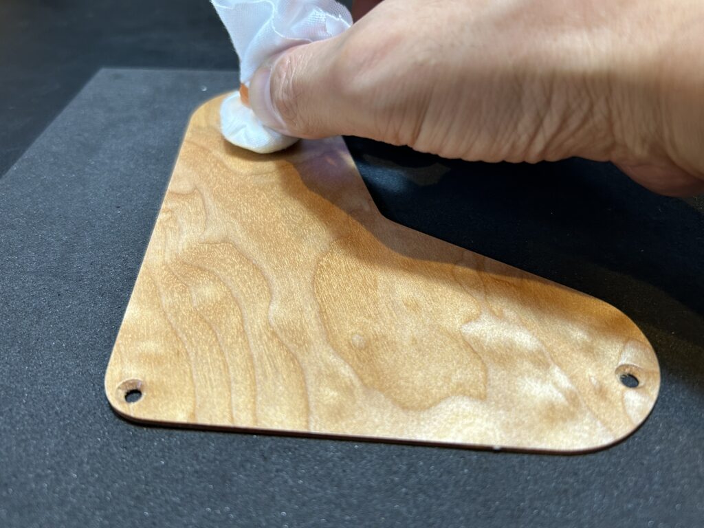 乾燥後は裏面をおもて面と同じようにオイルを塗布 → 弦通し部分の側面を乾いたウエスで拭き取る