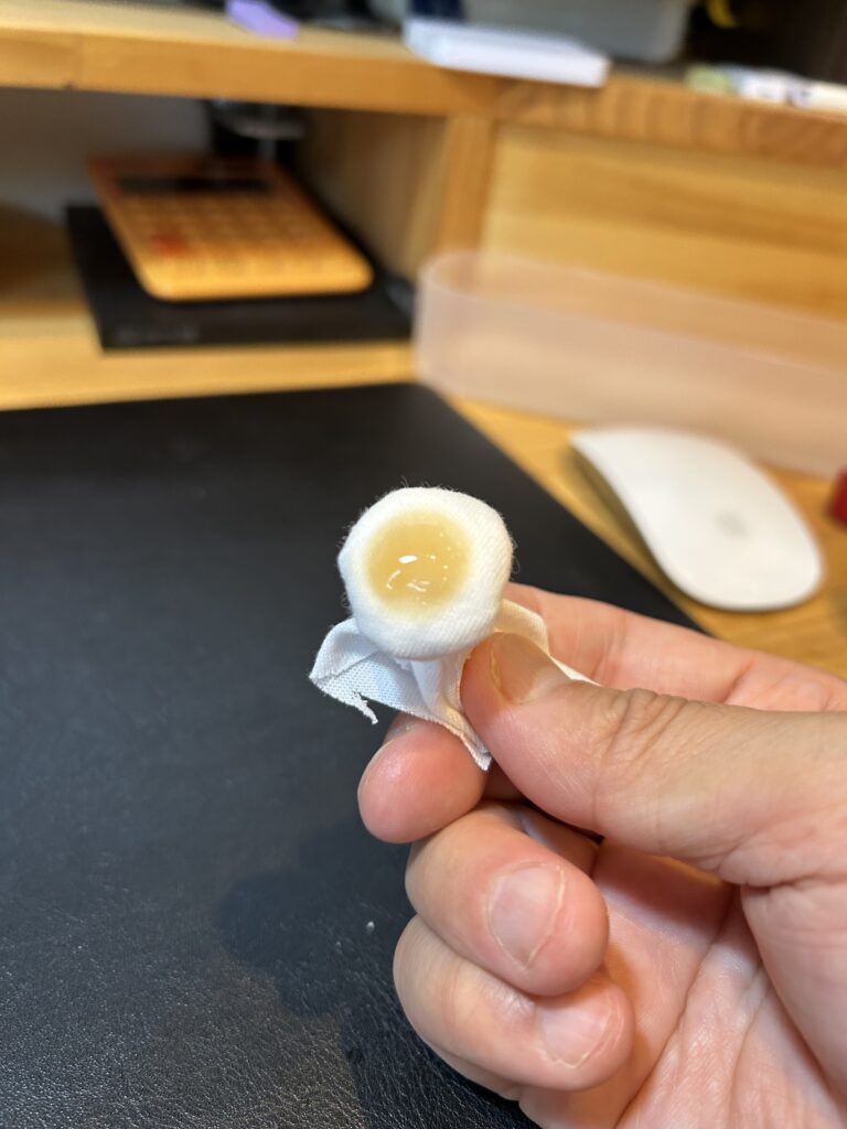 2時間ほどは木固め剤が滲み出てくるので、30分おきにシンナーで表面を拭きます。