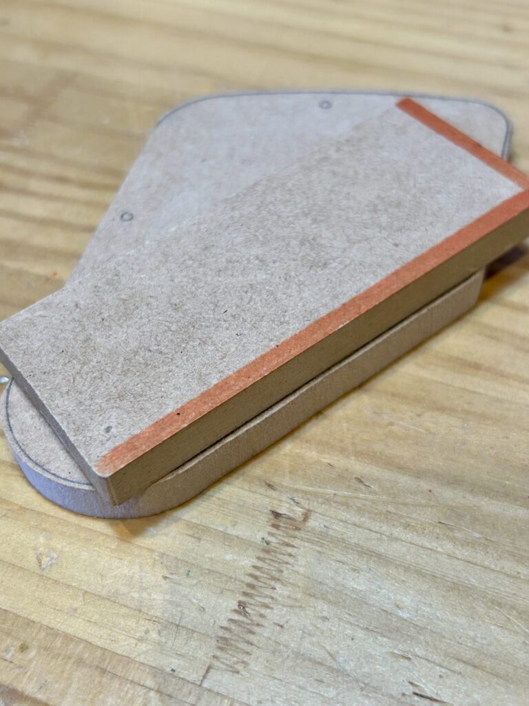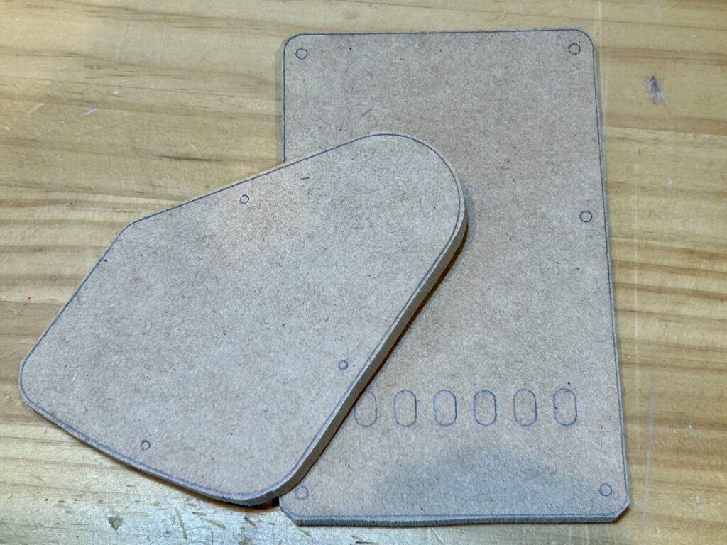 というわけで、MDF板に純正バックプレートから型を罫書き、カットとサンディングでテンプレートを作っていきます。