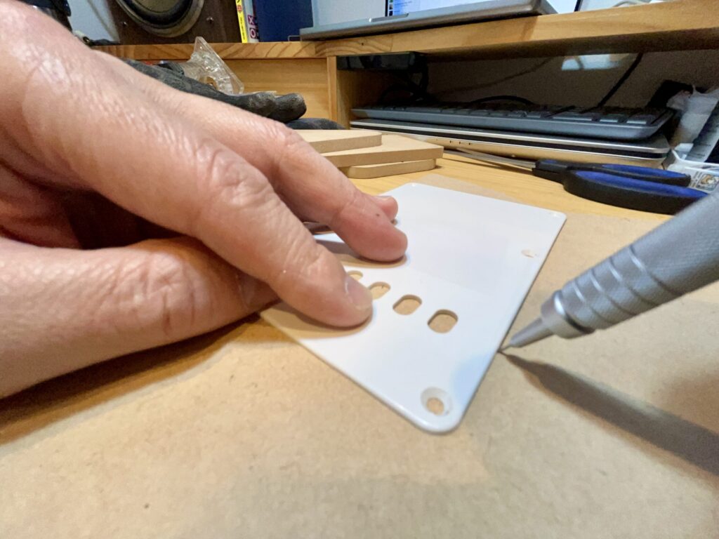 これまでも恐る恐る、純正バックプレートをトリマーガイドにしていたというのが本音ですが、このパシフィカに至っては子供のギターなので、上記のような失敗は許されない事情がありました。