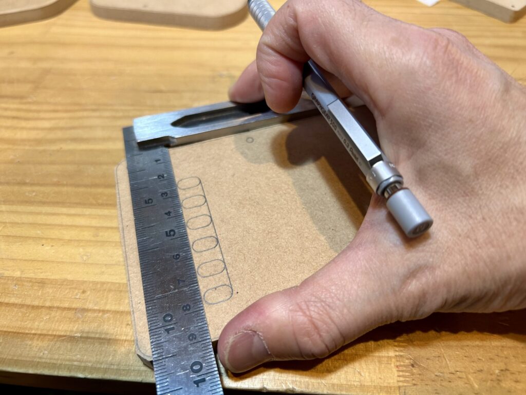 MDF板へバックプレートの型を書き入れる