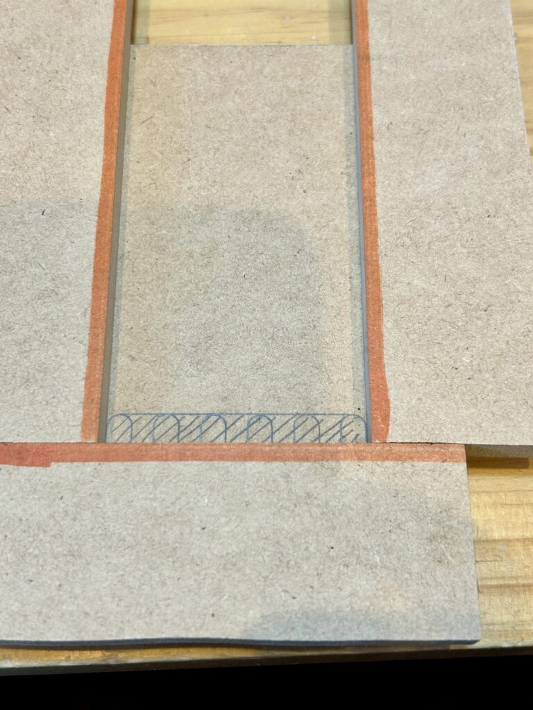 その準備として、直線部分にMDF板のガイドを両面テープで貼り付けます。