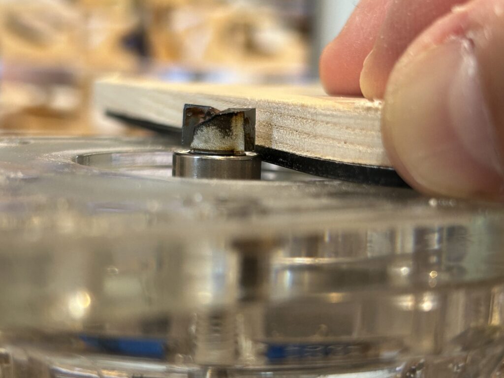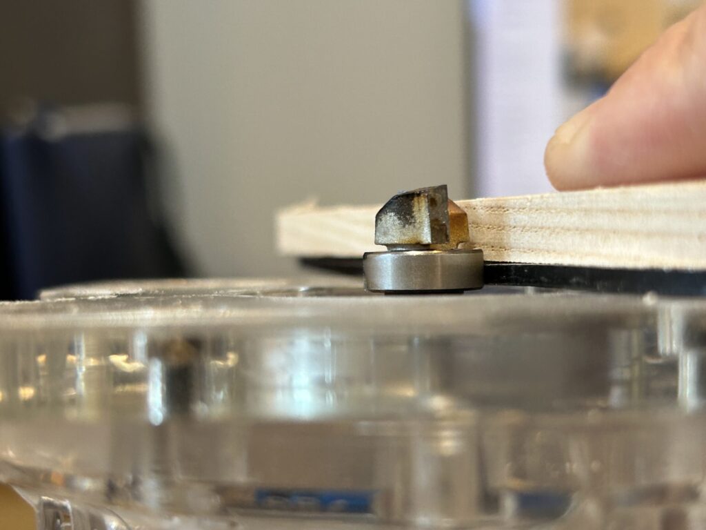 ベアリングが木材側まではみ出て当たると、ベアリングが木材をガイドにしてしまうので当たり前ですが木材は切れません。