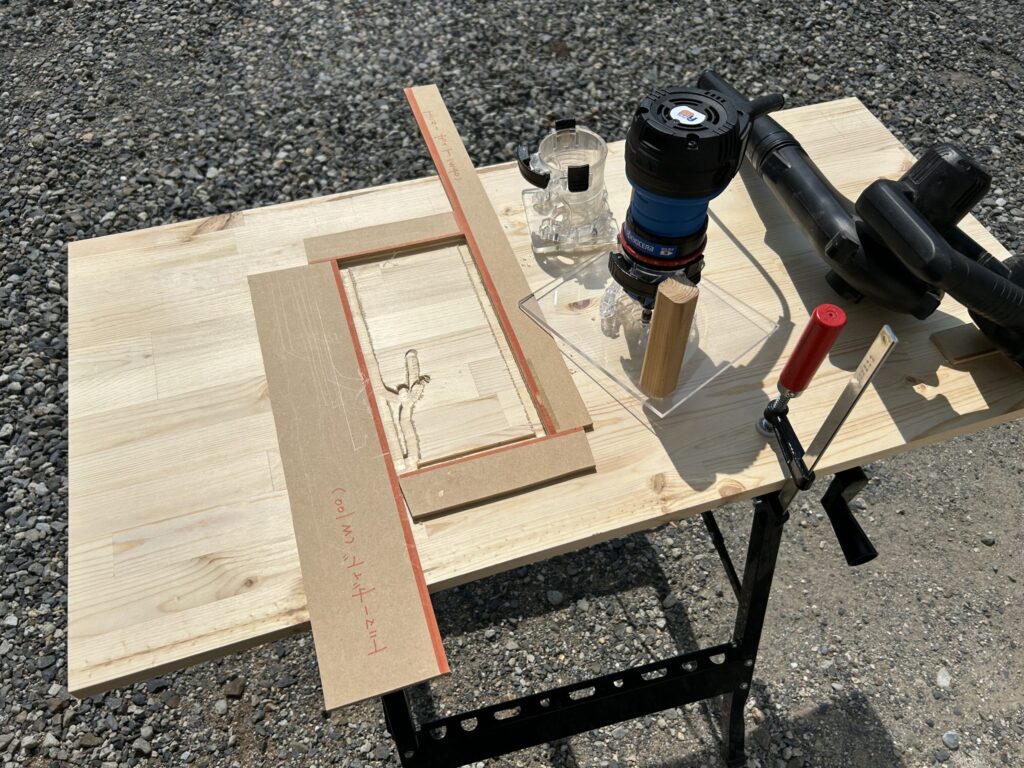 はじめにテーブルの裏側を丸ノコのベースがすっぽりはまるように、トリマーで加工していきます。