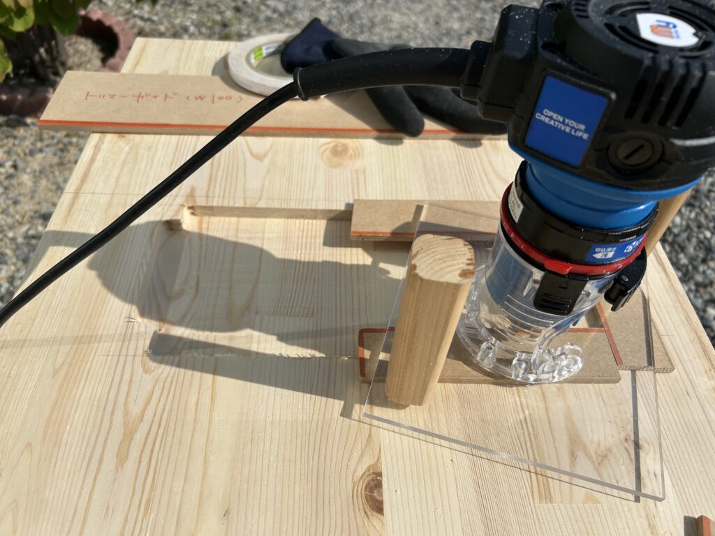 凸部分もガイドを当てて、トリマーで削っていきます。
