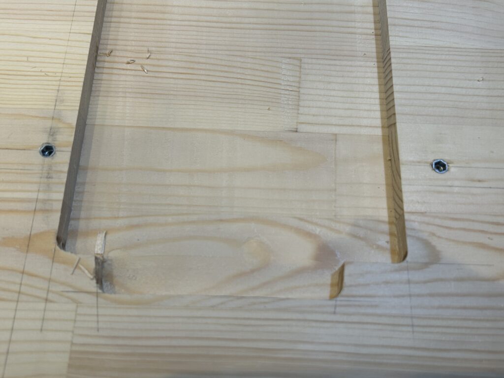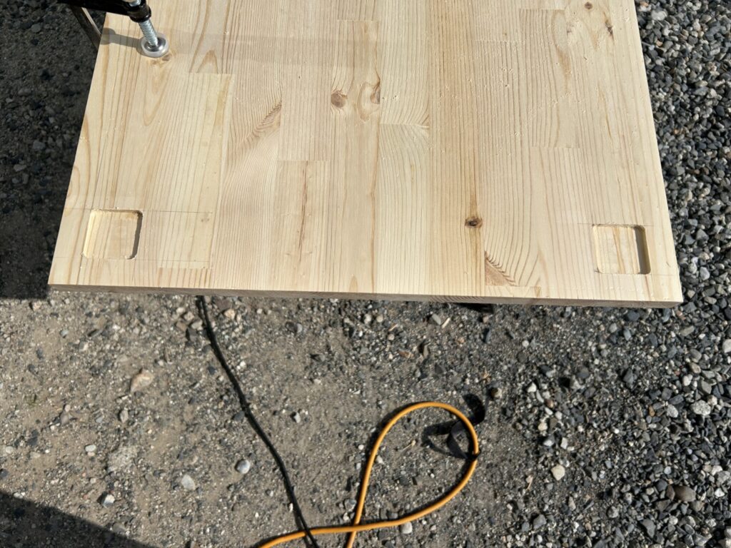 テーブル片側の2つの隅っこは、脚が取り付ける部分を削ります。