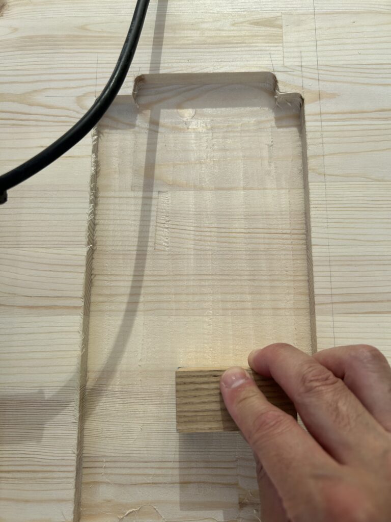 トリマーで削っただけでは凸凹してしまっているので、木片をサンディングブロックにし平面を作ります。