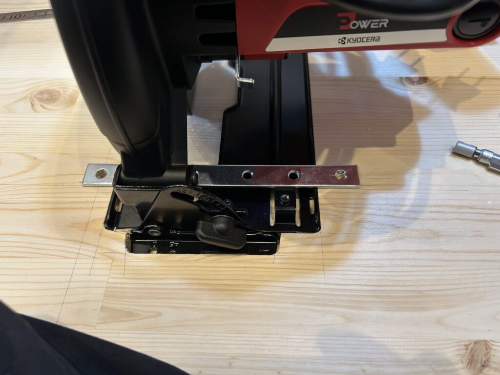 丸ノコ自体には、都合がよさそうなネジ穴は見当たらないので、金具を使って押さえ込むように取り付けることにします。
