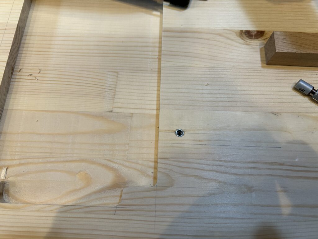 位置が決まったら鬼目ナット用の穴を開け、鬼目ナットをねじ込みます。