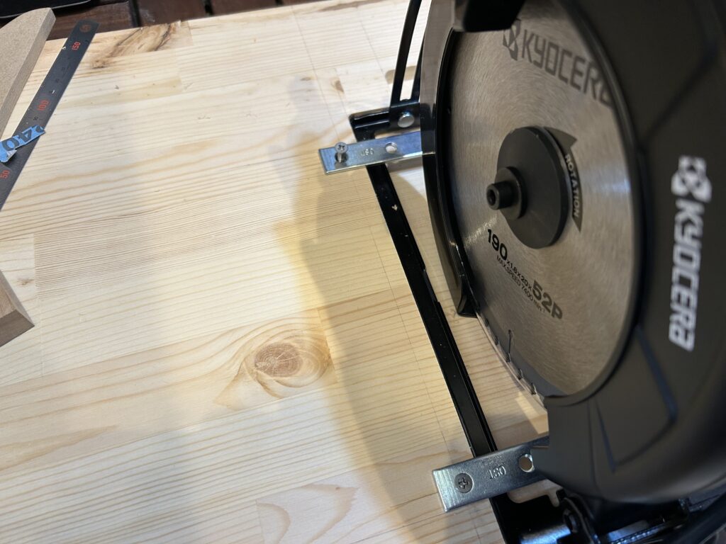 板のままで厚みを切り分けるのは、流石にどんな丸ノコでも切り込み深さが足りないので、制作するものの形を作ってから切り分けることを前提に、テーブルソーを作っていきます。