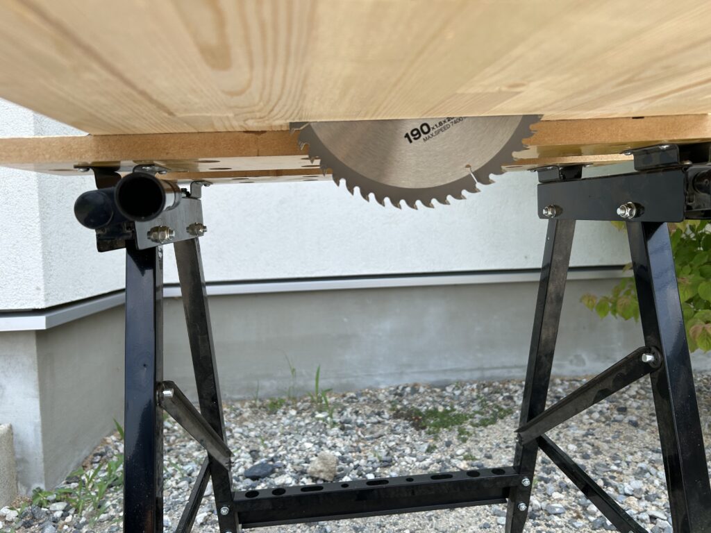 詳しくは「脚加工→完成編」でお見せしますが、この固定だと最終的に丸ノコのチップソーがテーブルの上に上がらなくなります。ユニクロプレートに惜しくも当たってしまって。