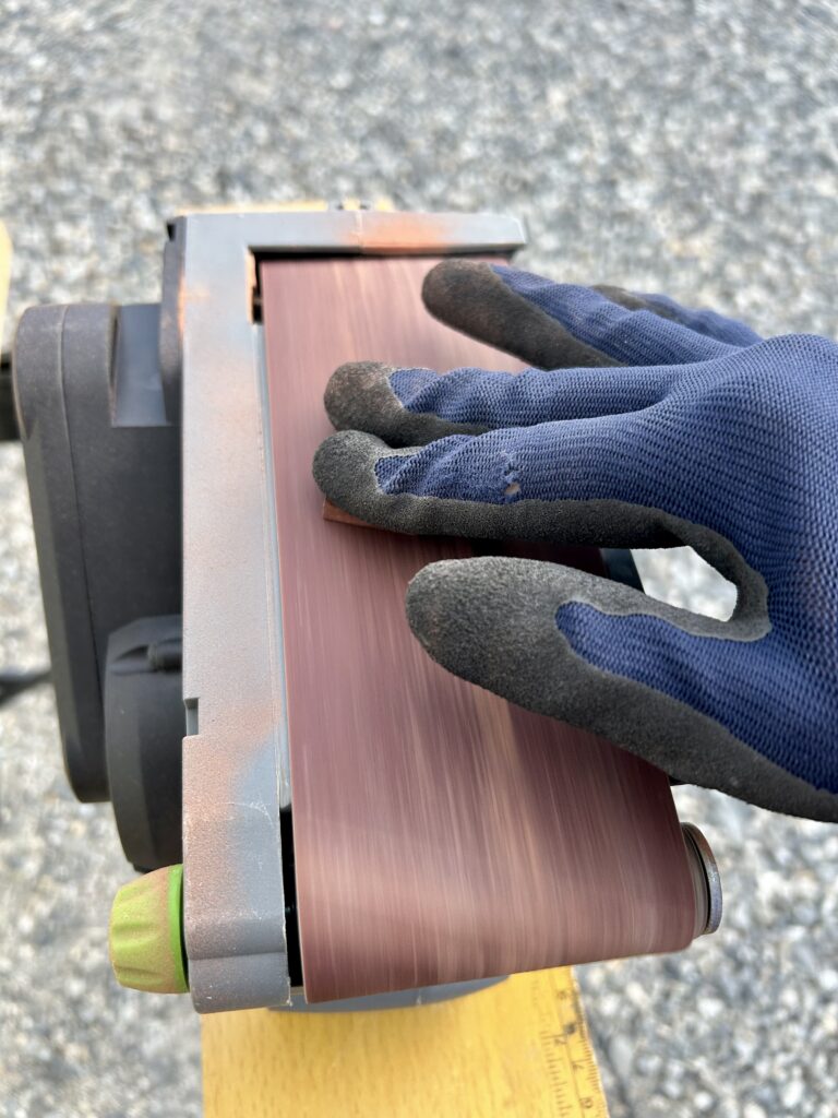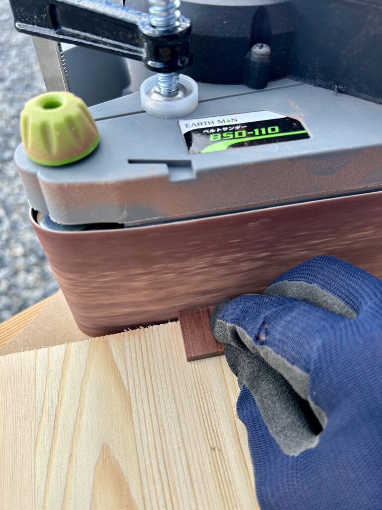 次はベルトサンダーを横に固定して、側面が垂直になるように横から削っていきます。