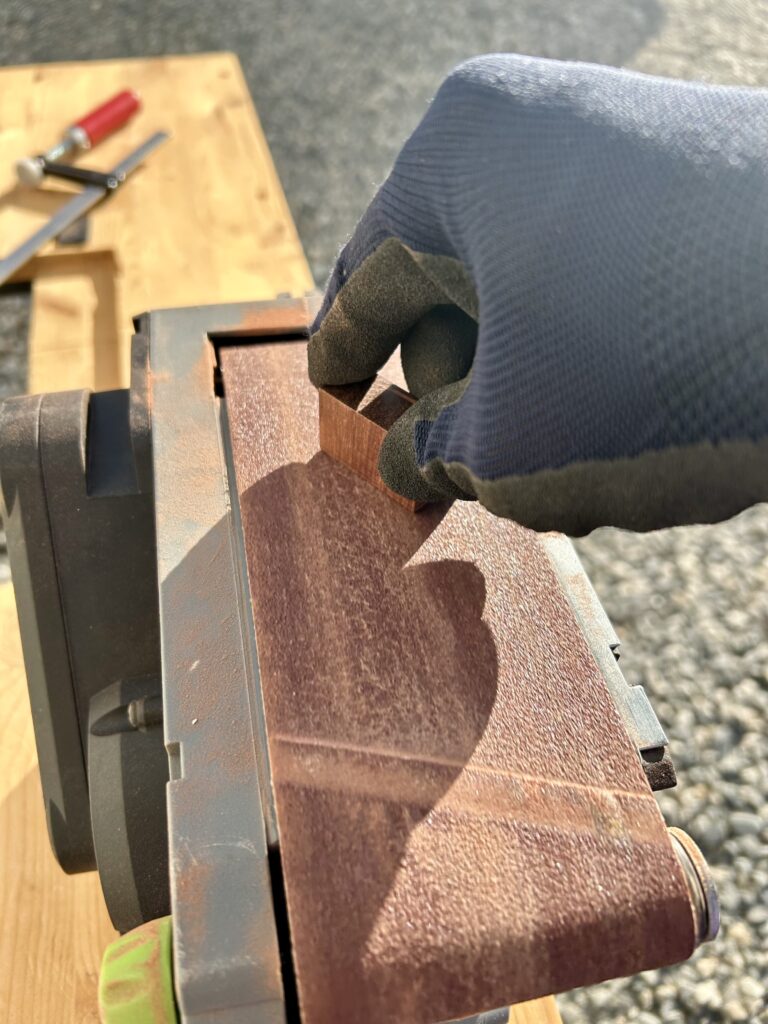 かなり形を整え接着しましたが、わずかな段差をなくすため再びベルトサンダーで整えます。