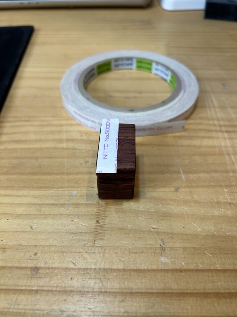 カットした3つを接着してブロックを作りますが、そのうち1つは輪ゴムが引っかかる部分になるので、薄くして他のものより一回り小さくしていきます。